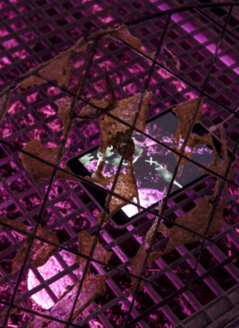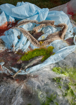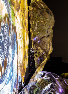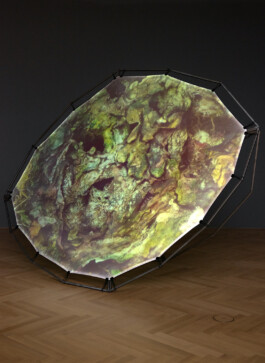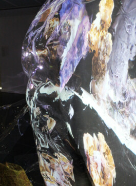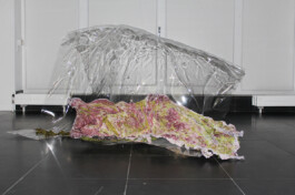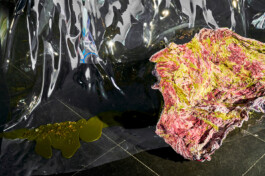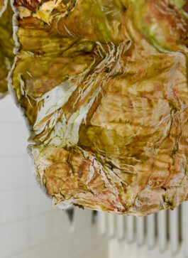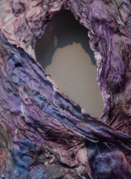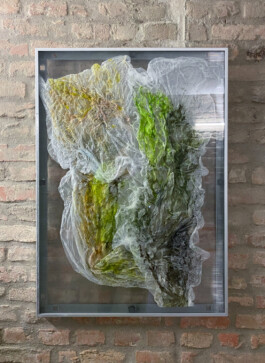 The living processes of the organic substances ensure that they change their consistency and color in their growth and decay. As part of an exchange with the environment and surrounding materials, the fabrics dry and warp, and dissolve the surface. The hybrid objects unite organic and synthetic materials to form novel image surfaces of colors and textures that independently react to each other in the process.